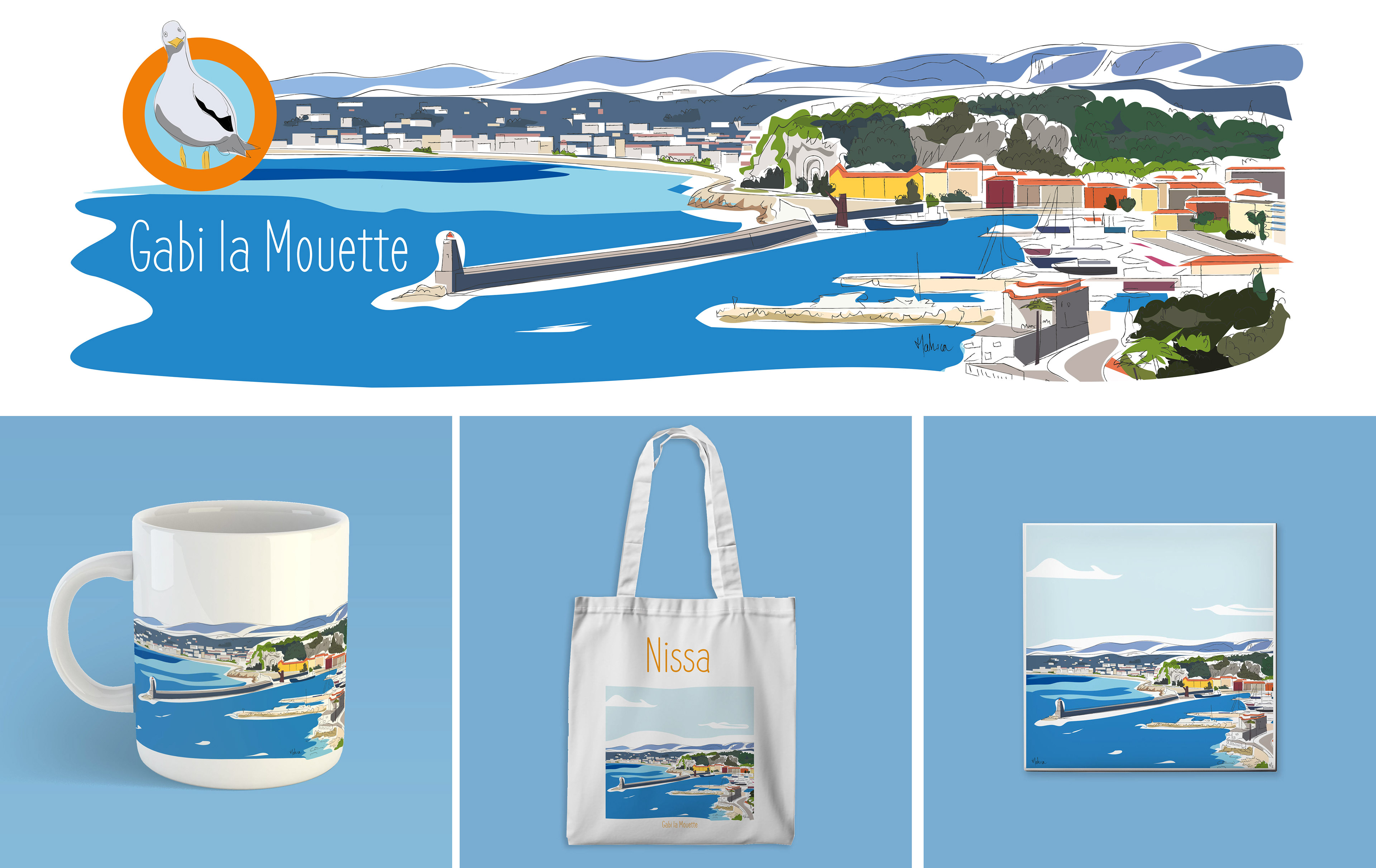 Illustrations patrimoniales sur Nice pour la collection de livres Gabi la Mouette, déclinées ensuite sur différents supports (mug, sac, carreaux) en vente ici